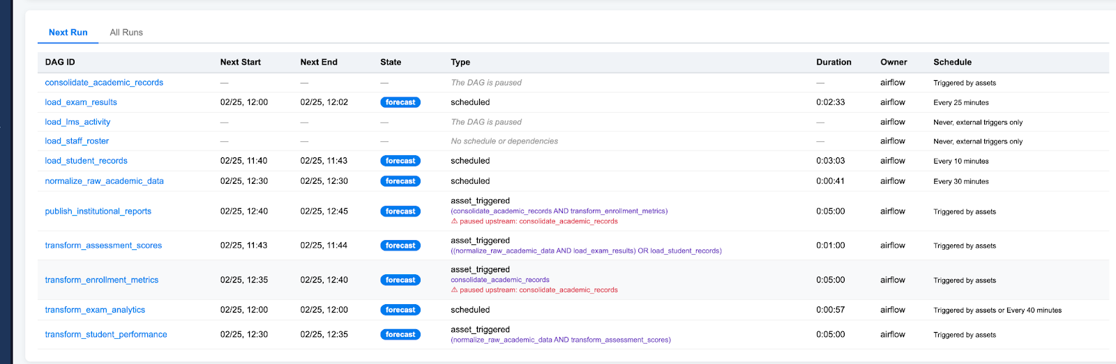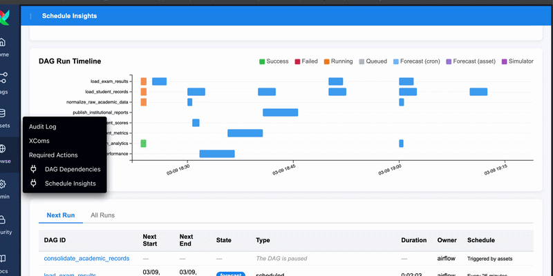 As more teams contribute DAGs to a shared Airflow environment — as is the case at Uncommon Schools, where multiple teams orchestrate data across a large network of schools — scheduling complexity compounds quickly. Each team adds their own timing requirements, and as run durations drift, overlap and resource contention become increasingly hard to spot from any single vantage point. Schedule Insights gives you a cross-team view — so you can see potential collisions before they become incidents. And when a DAG pile-up does occur, the historical run data lets you work backward and reconstruct what likely triggered the cascade.