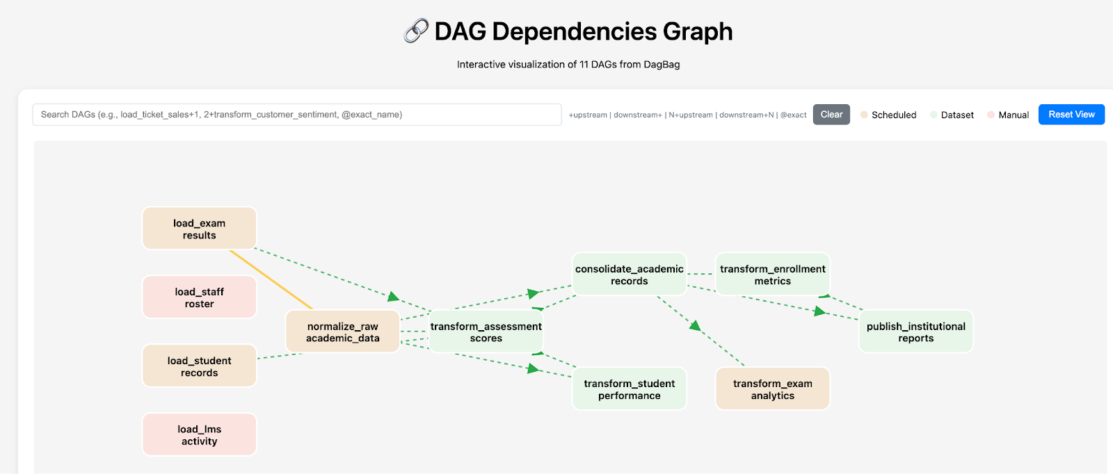 Instead of fictional cinema DAGs, we now ship example educational DAGs that mimic real academic data platform dependency patterns. These DAGs are not production pipelines — they simply replicate common educational orchestration structures and asset relationships so users can test complex scheduling scenarios in a realistic setting.