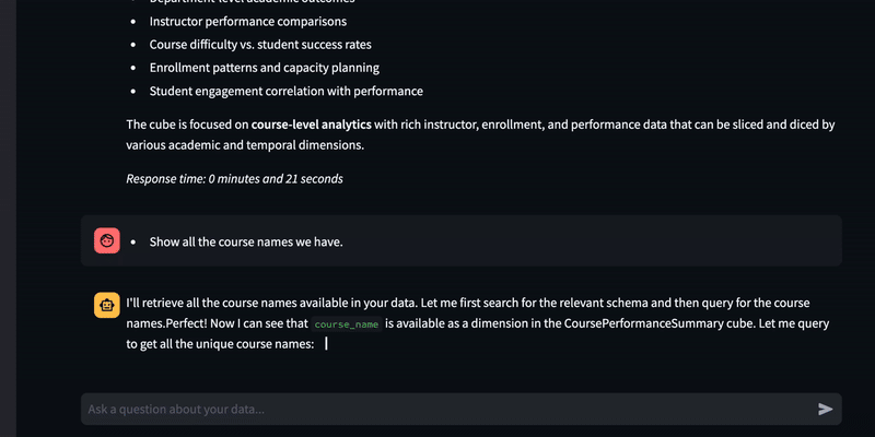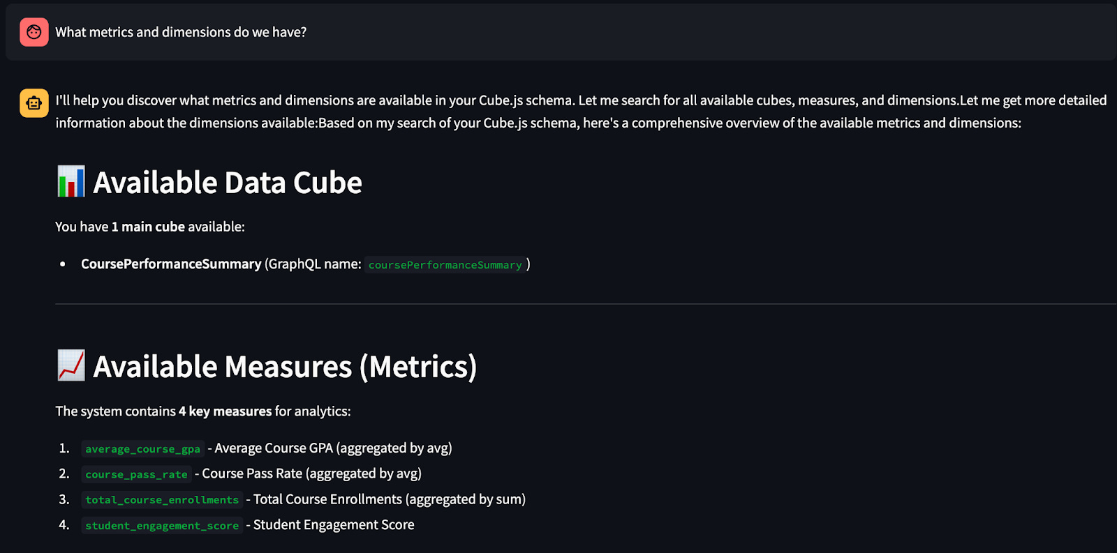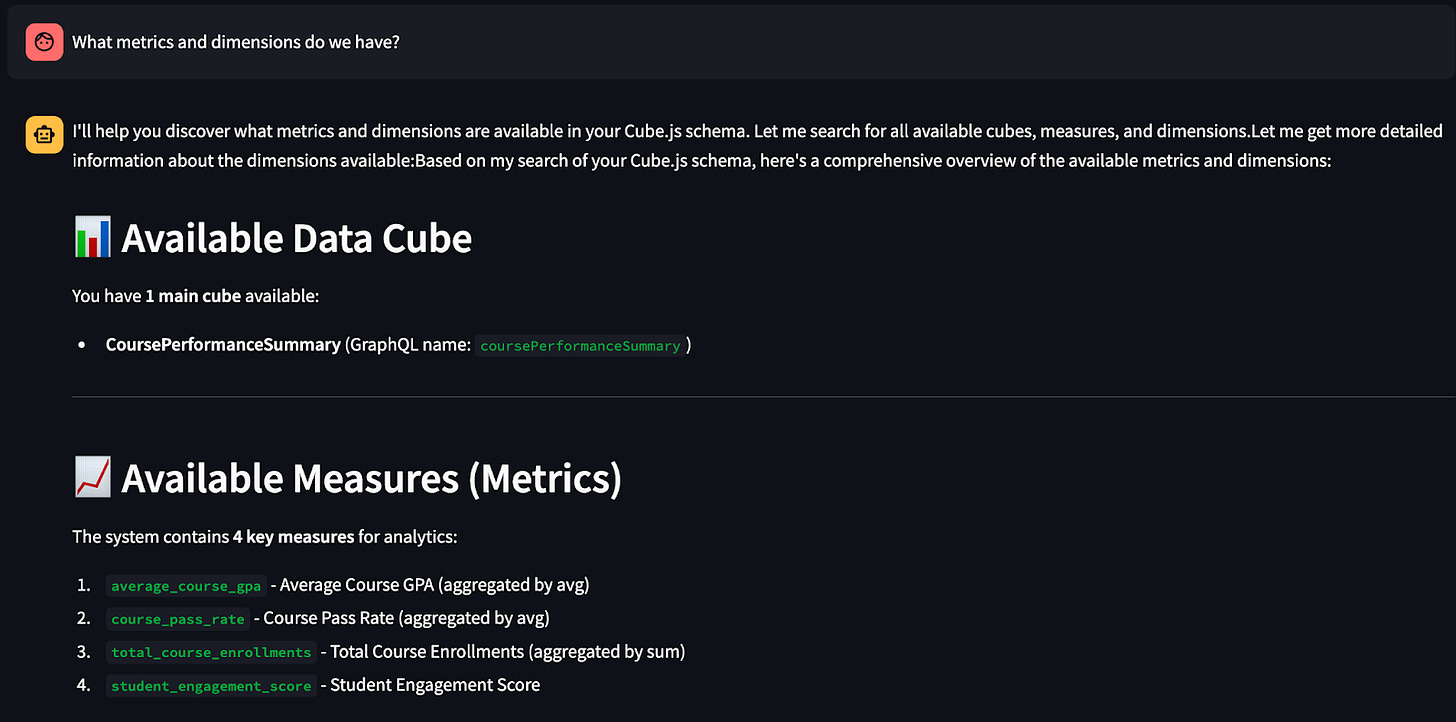This naturally led us to a bigger idea. If Cube already exposes a governed semantic layer through SQL, REST, and GraphQL, why force natural-language analytics back into brittle English-to-SQL translations? What if users could converse directly with the semantic layer instead?