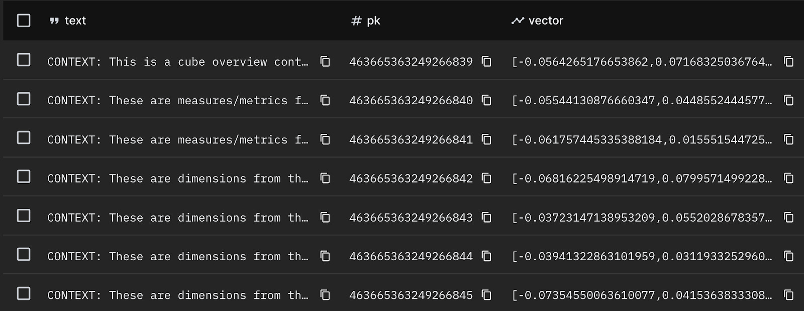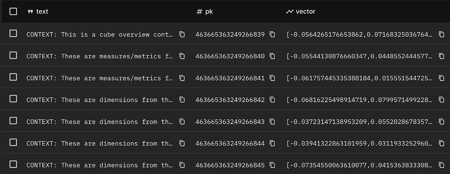 These embeddings are generated using the cube-to-rag library (https://pypi.org/project/cube-to-rag/), which we use to extract and embed Cube schema metadata into the vector store.
