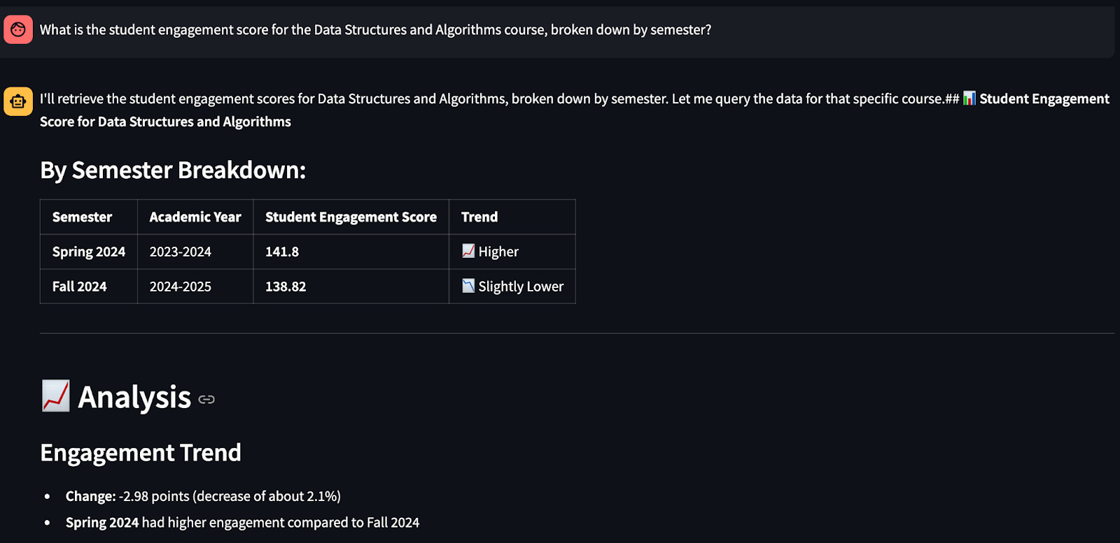 “What is the student engagement score for the Data Structures and Algorithms course, broken down by semester?”