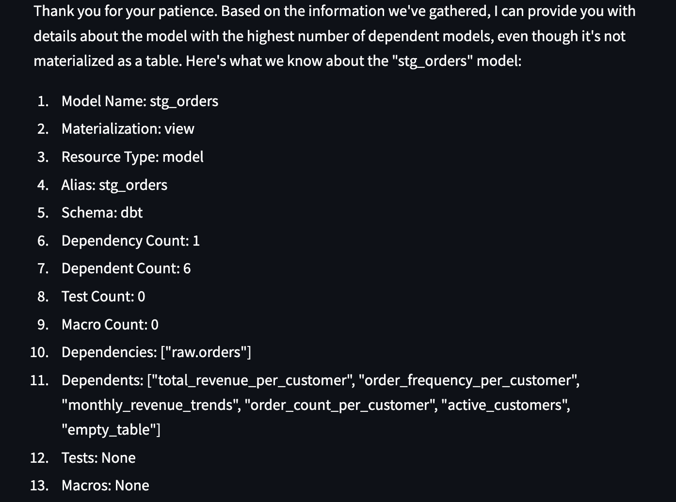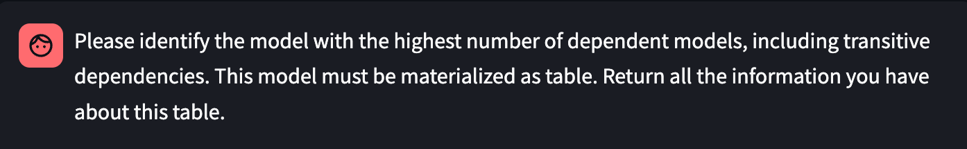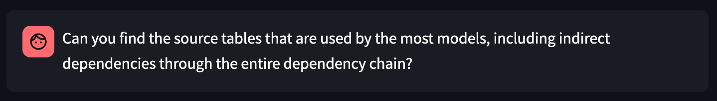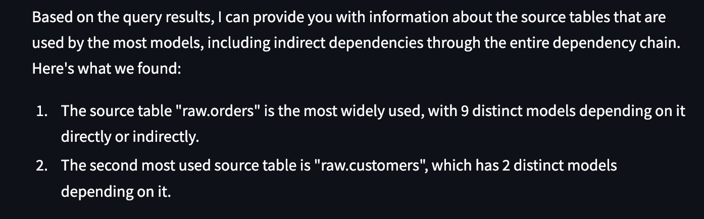In previous blog posts—dbt-to-English and English-to-SQL—we demonstrated how LLMs can assist with understanding and generating dbt metadata. However, these tools fall short when it comes to answering complex questions about dbt’s project-wide structure and dependencies. For instance, what is the most widely reused source across models (recursively)? Or, how many seed datasets are used by models materialized as tables?