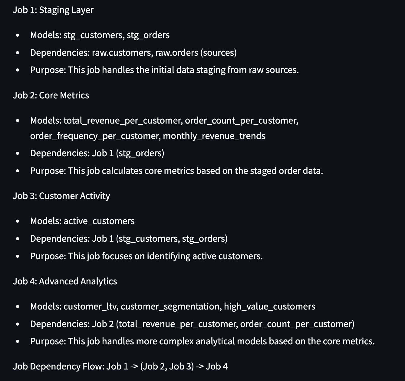 And it delivers! The model intelligently separates our graph into four distinct jobs and describes the cross-job dependencies clearly.