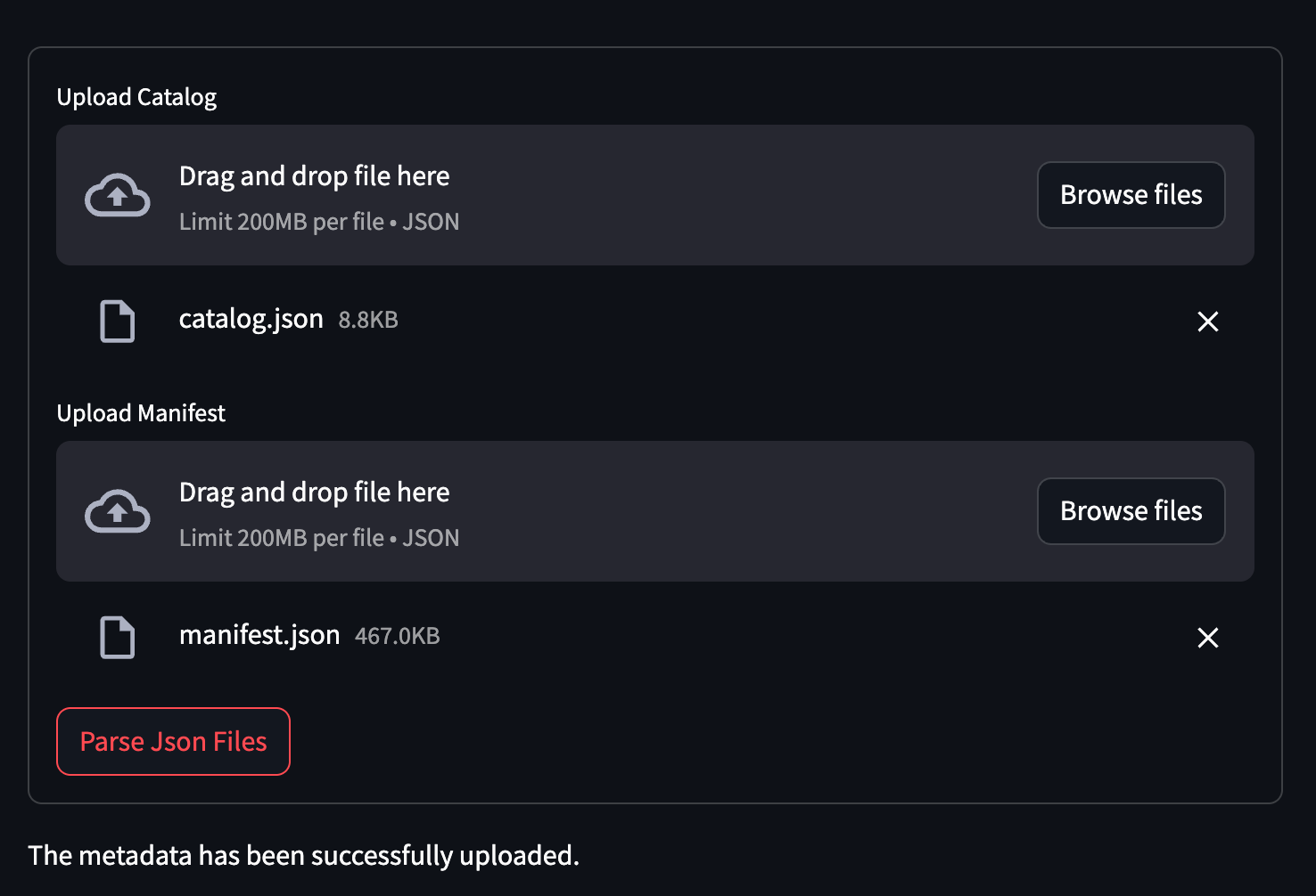 http://localhost:8501/Navigate to the “Load DBT Manifest” page from the sidebar. You’ll be prompted to upload your manifest.json and catalog.json files. If you have your own, upload them; otherwise, use the sample files located in DbtExampleProject/target within the repo.