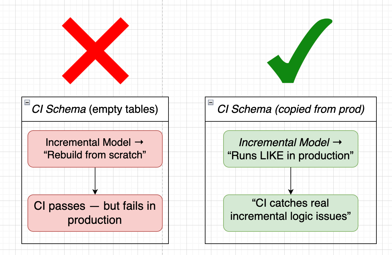 dbt-incremental-ci copies your production incremental models and snapshots into your CI schema so you can test against real production data, not empty tables.