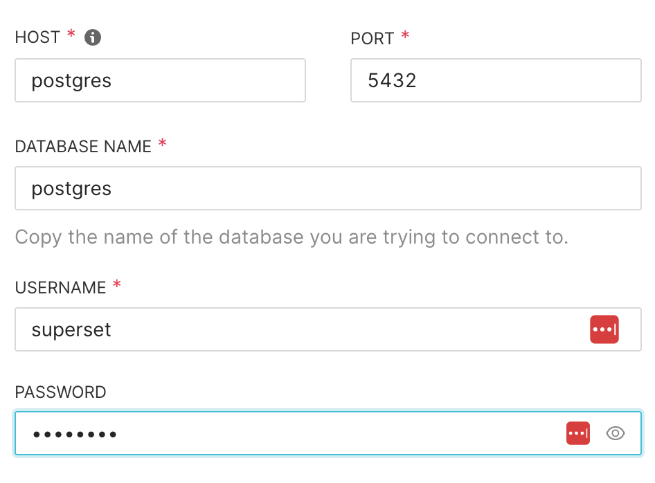 First, we’ll add a database connection — specify “postgres” as both the host and the database name, and use “superset” for the login and password.