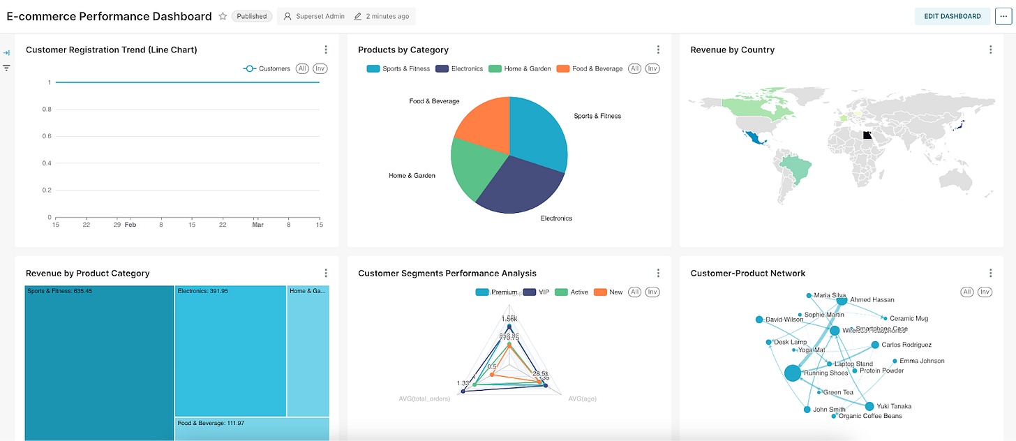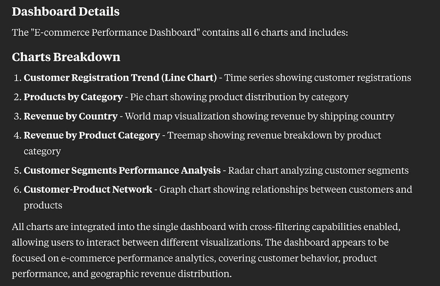 Once connected, we can create a few simple charts from the database tables and organize them into an E-commerce Performance Dashboard.