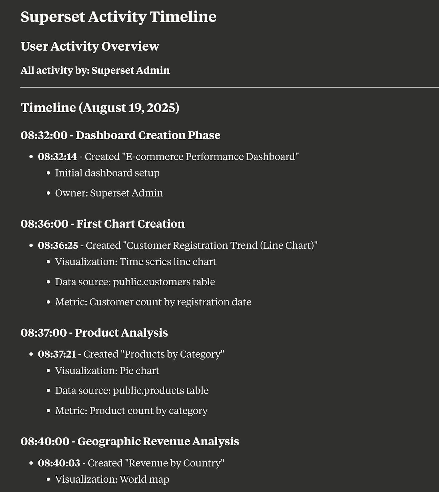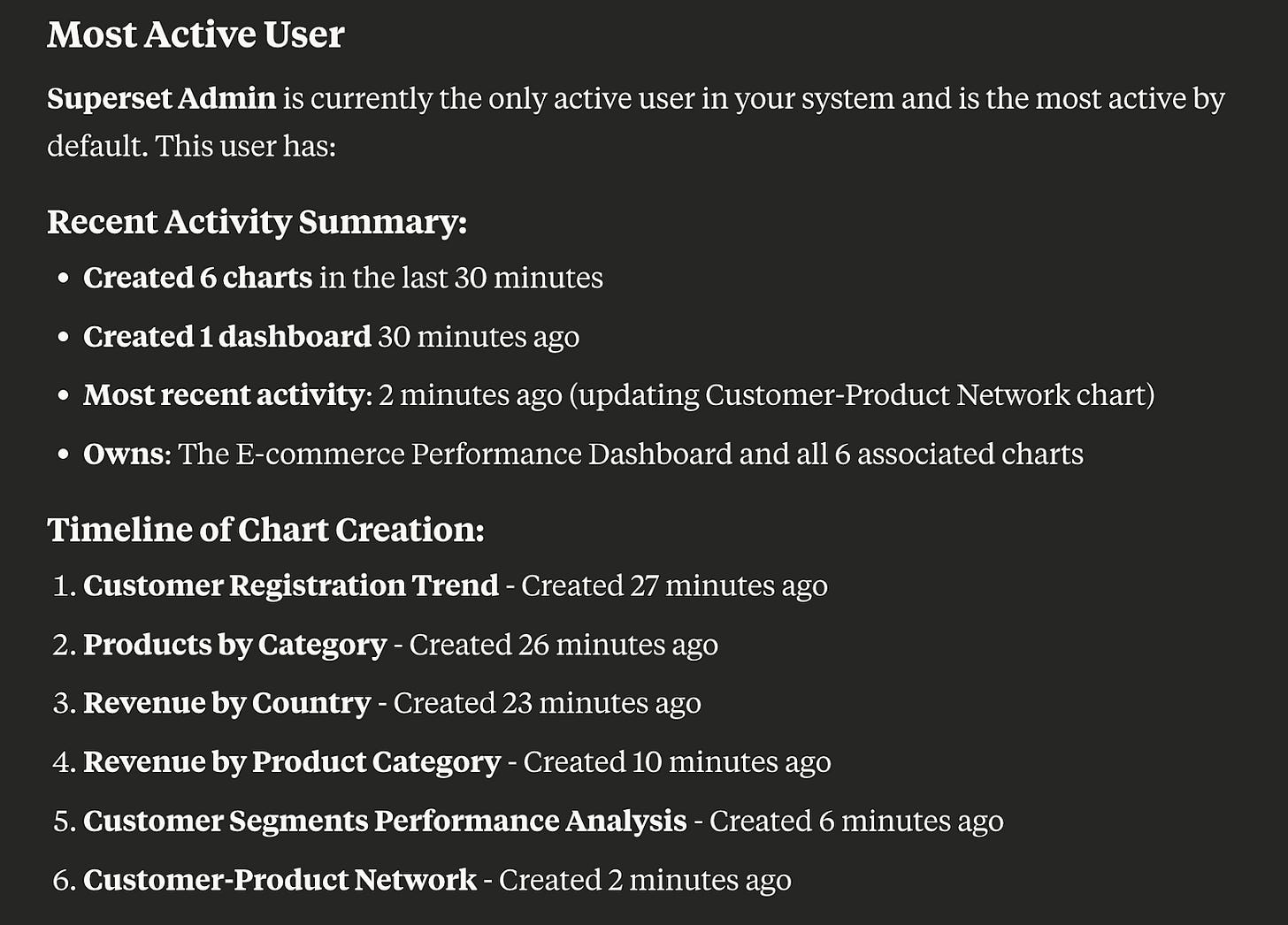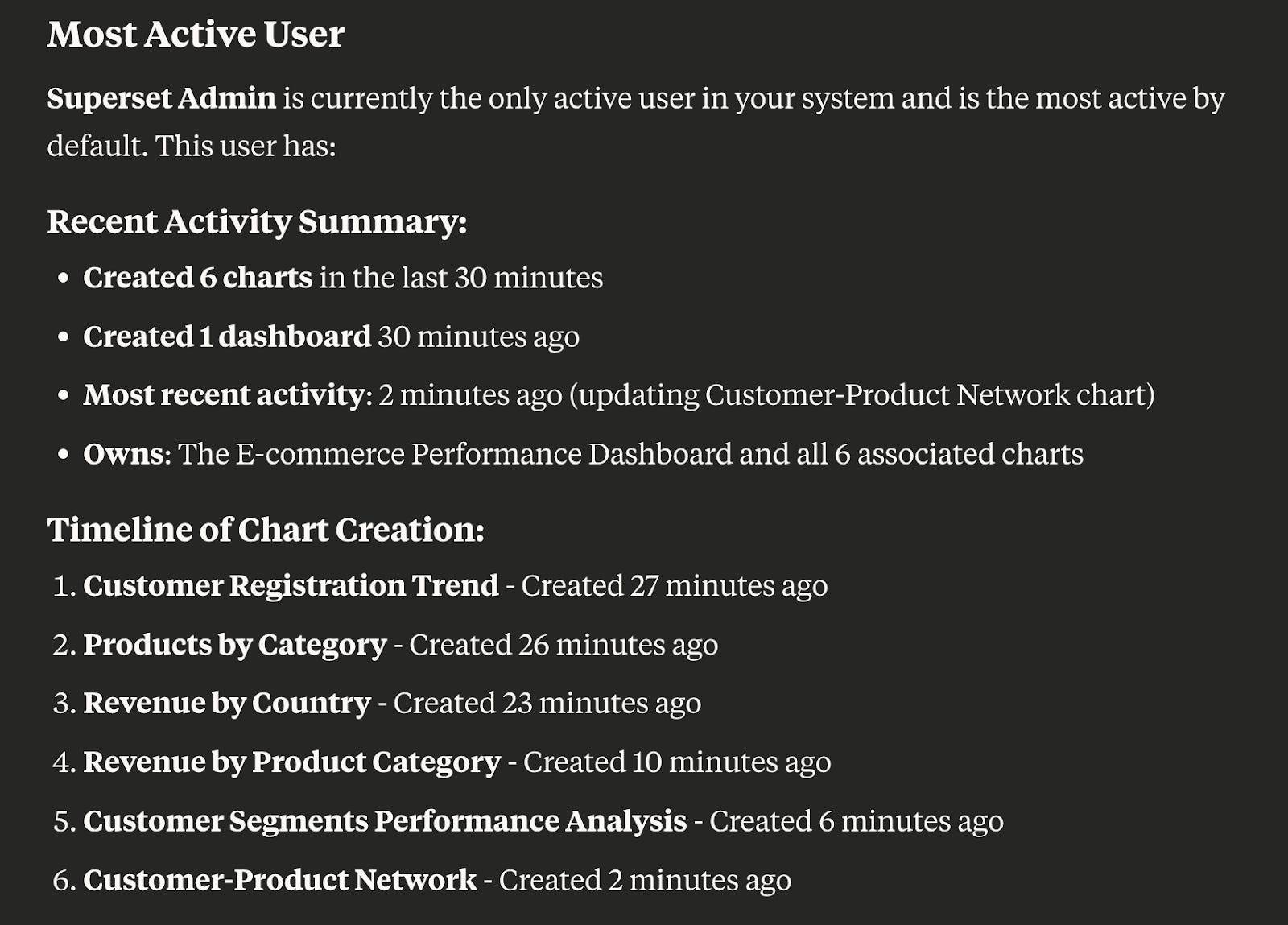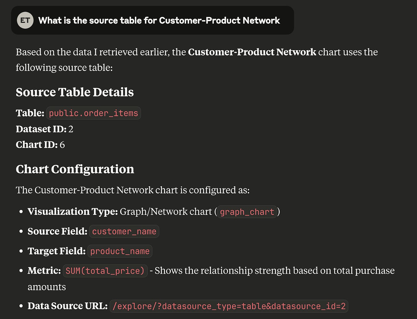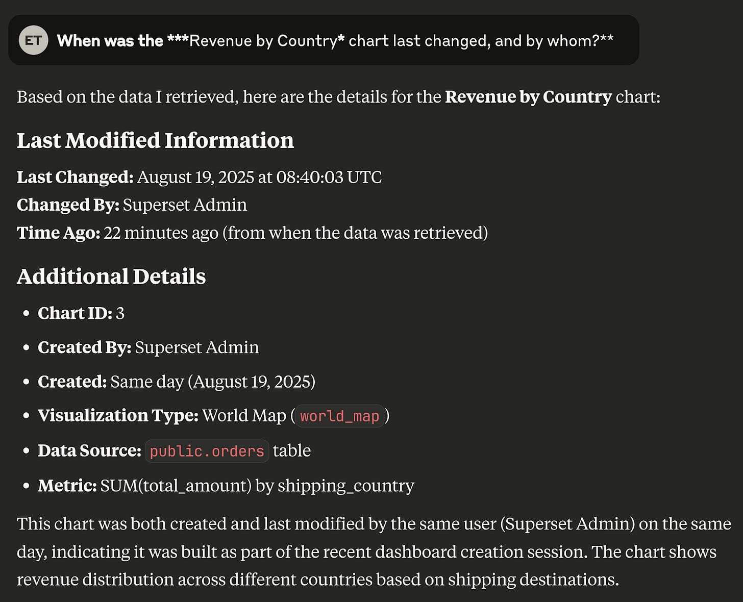 Superset MCP turns the often painful task of navigating dashboard metadata into a fast, intuitive conversation. Whether you’re an educational administrator tracking changes to student performance dashboards, a data analyst identifying which tables feed into critical reports, or a team lead trying to understand who’s been most active in your BI environment—you can now skip the clicks, menus, and manual searches. Just ask in plain language, and get precise, actionable answers.